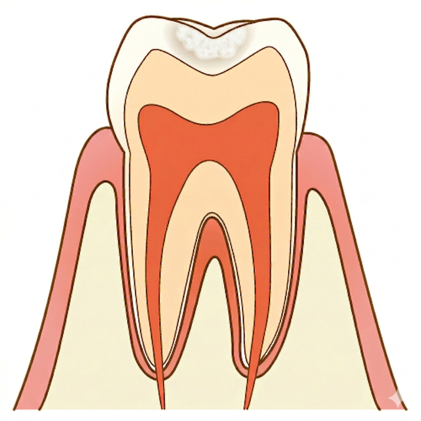 CO〜C1(初期虫歯)は、歯の表面のエナメル質が溶け始めている段階です。虫歯がまだ象牙質や神経まで達していないため、痛みやしみるといった症状はほぼありません。見た目にもほとんど変化がなく、放置されがちです。