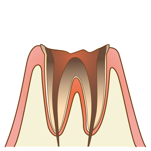虫歯が神経まで達する(C3~C4)と痛みが生じます。何もしなくてもズキズキするほどの強い痛みです。その状態の虫歯をそのまま放置すると、やがて神経が壊死し、痛みを感じなくなります。