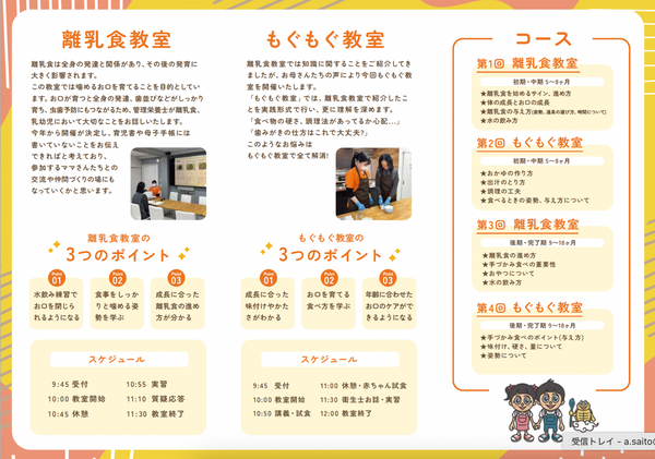 離乳食教室では、離乳食の与え方や食べる時の姿勢のお話、水飲みの実習などを中心に行っています。もぐもぐ教室では、離乳食教室で紹介したことを実践形式で行い、更に理解を深めます。